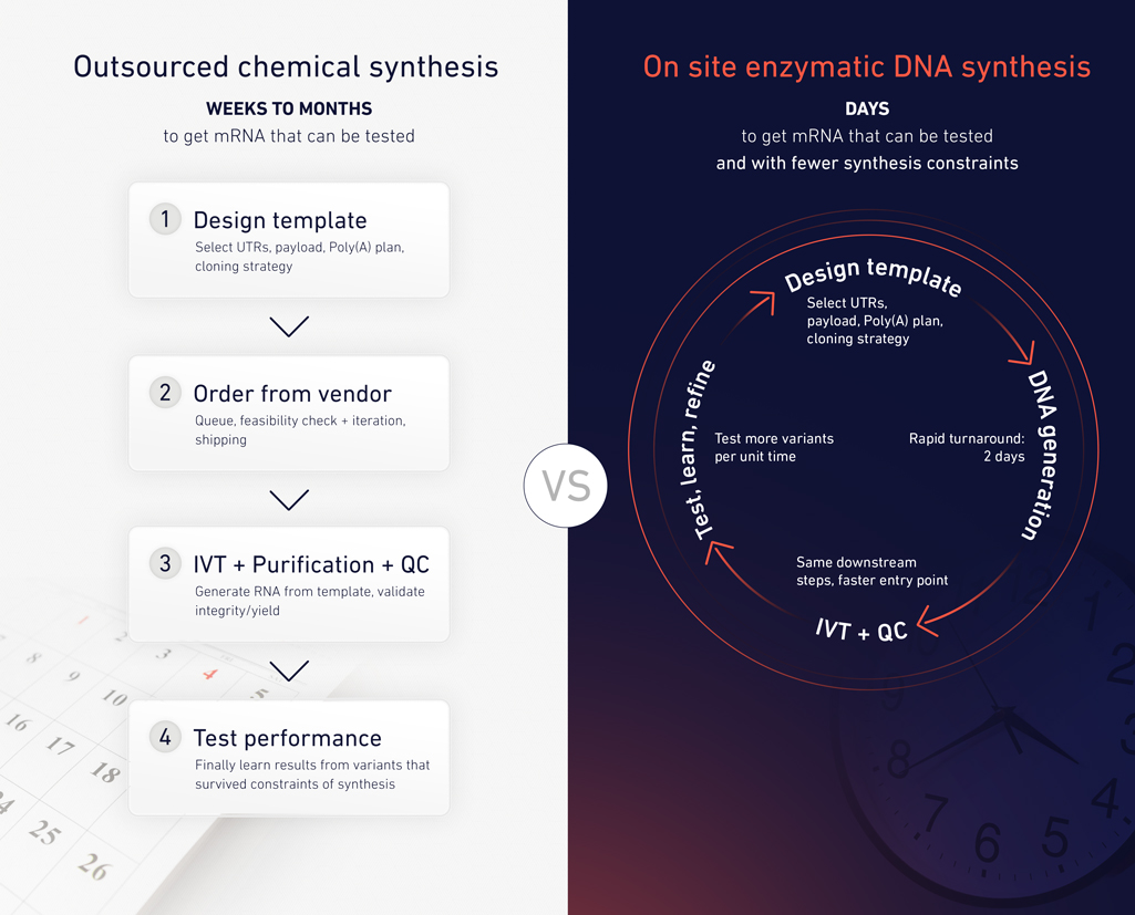 As a result, researchers often encounter implicit constraints: poly(A) lengths that are “good enough,” design choices shaped by vendor capabilities, and iteration cycles slowed by external dependencies.